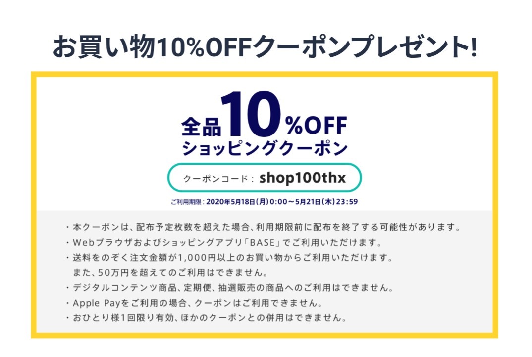 さて、21日まで使えるクーポンがBASEから発行されました。