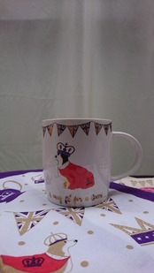 王冠を被り、赤いマントを羽織ったコーギーのマグカップです。