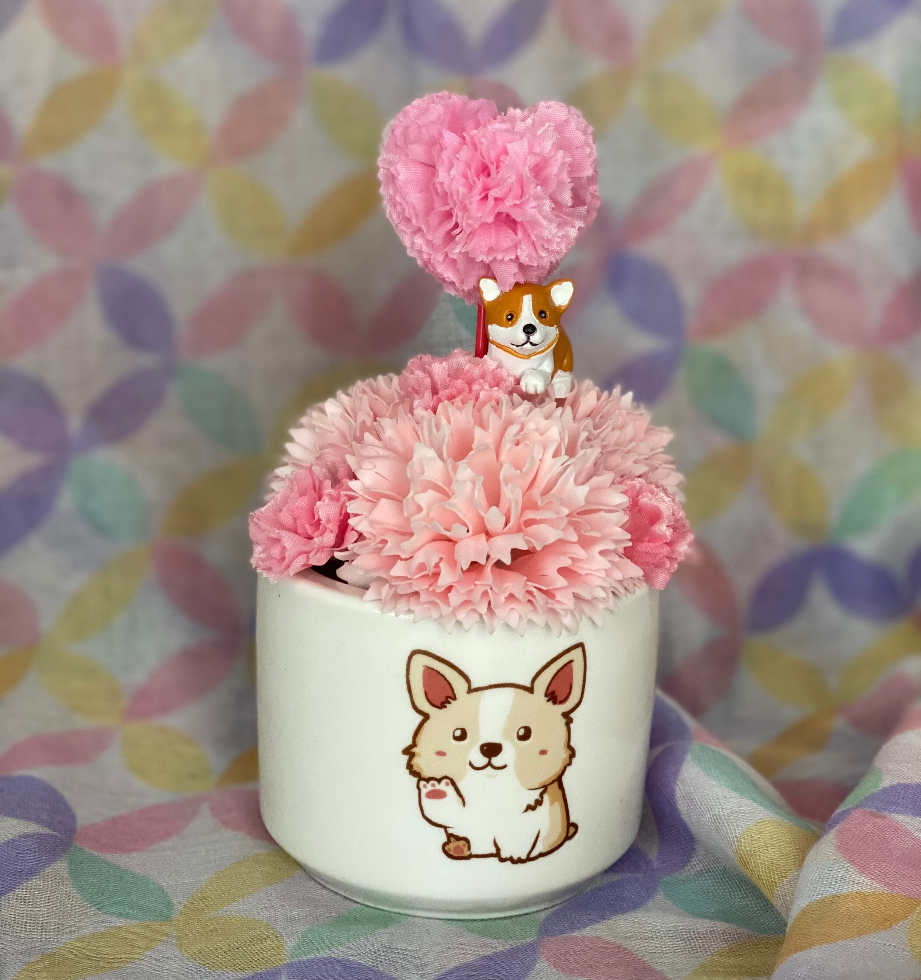 ちょいちょいっと足を上げるポーズのコギの絵がアレンジメントのベースに描かれています。