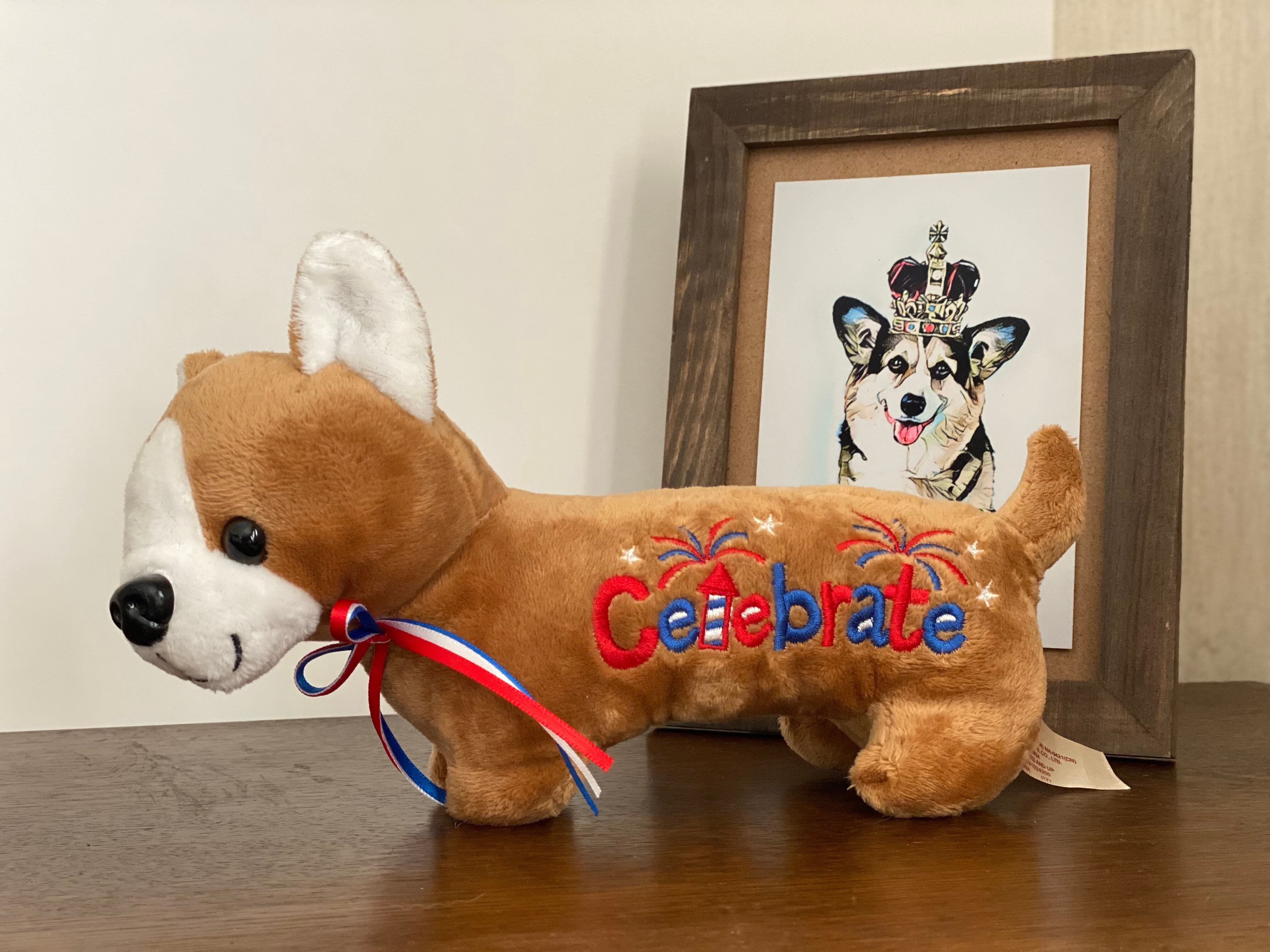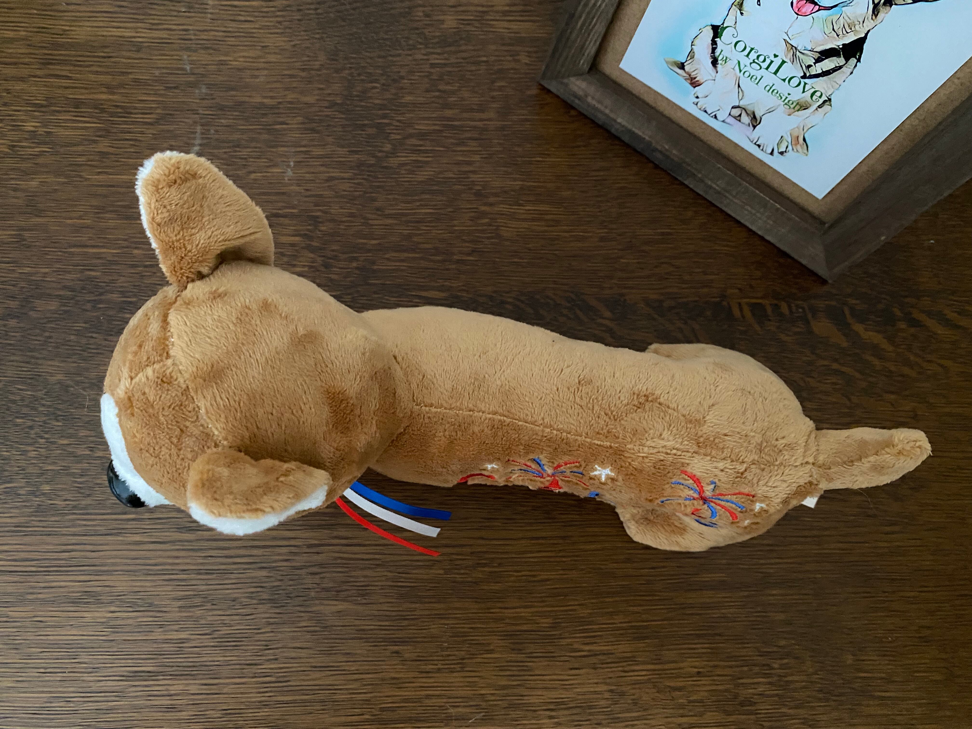 アメリカの独立記念日をお祝いして製作されたコーギーのぬいぐるみ