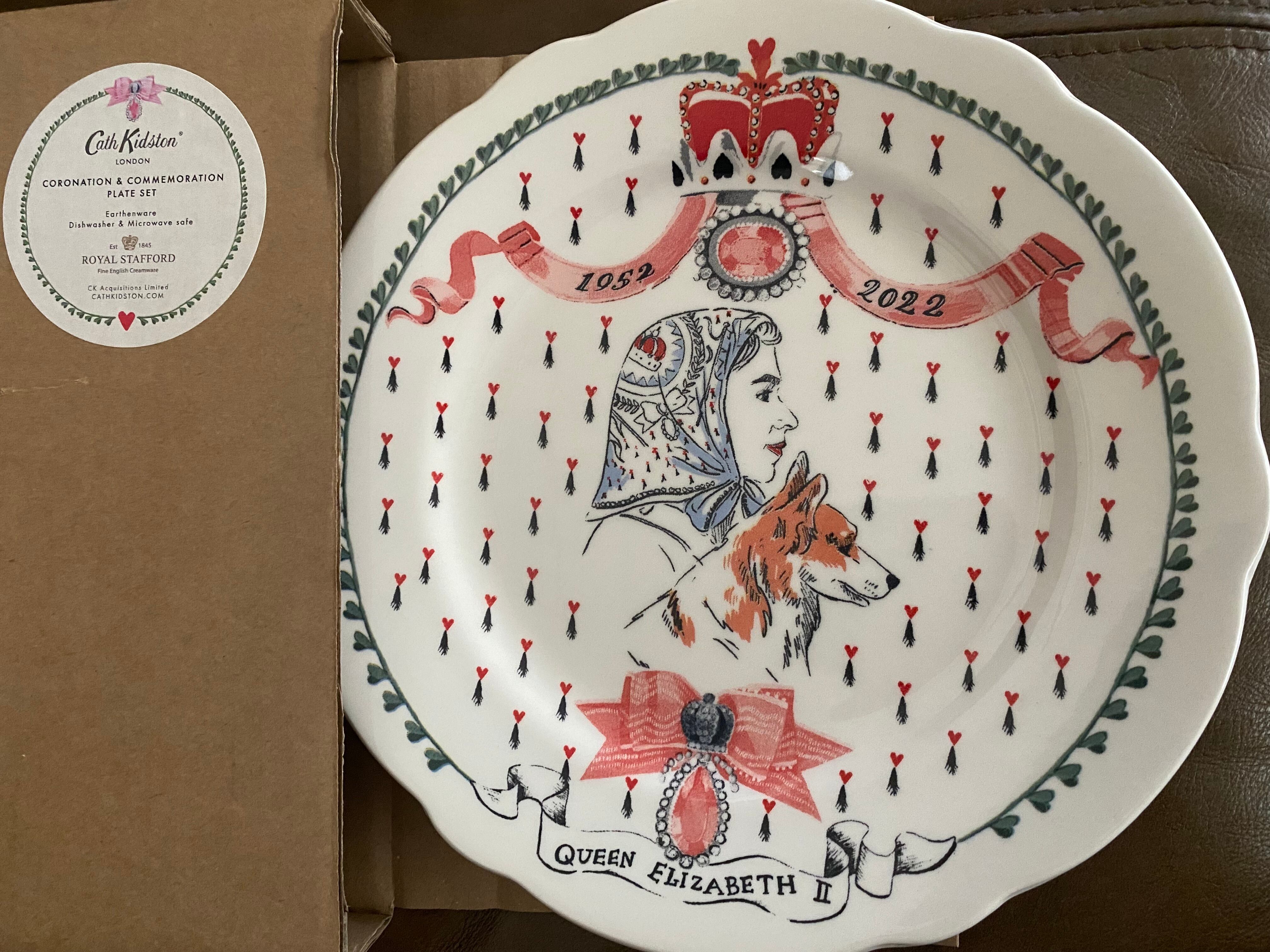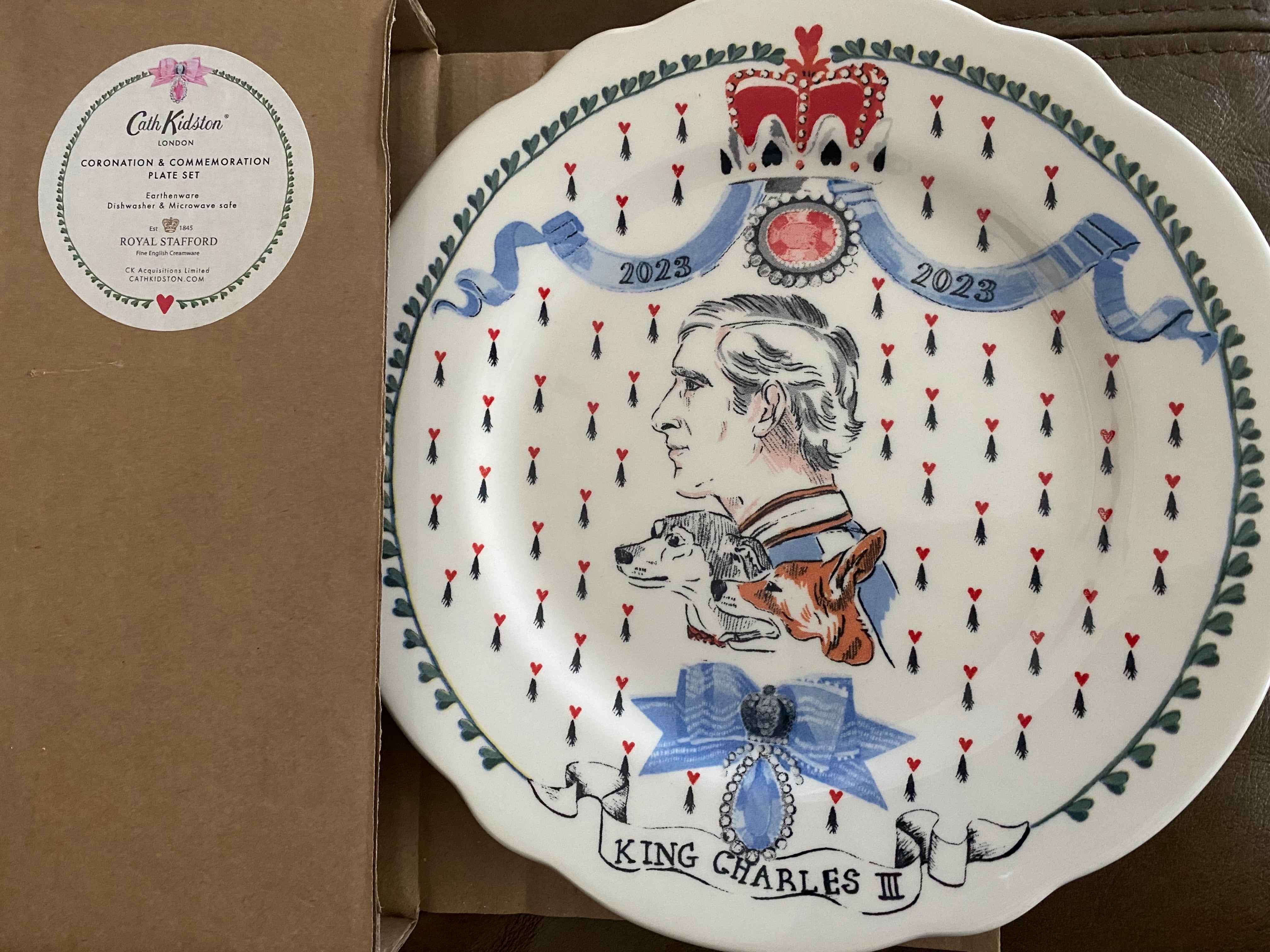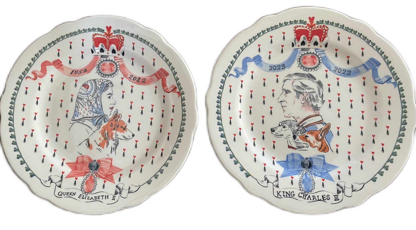 チャールズ国王(とジャックラッセルテリア)が描かれたプレートは